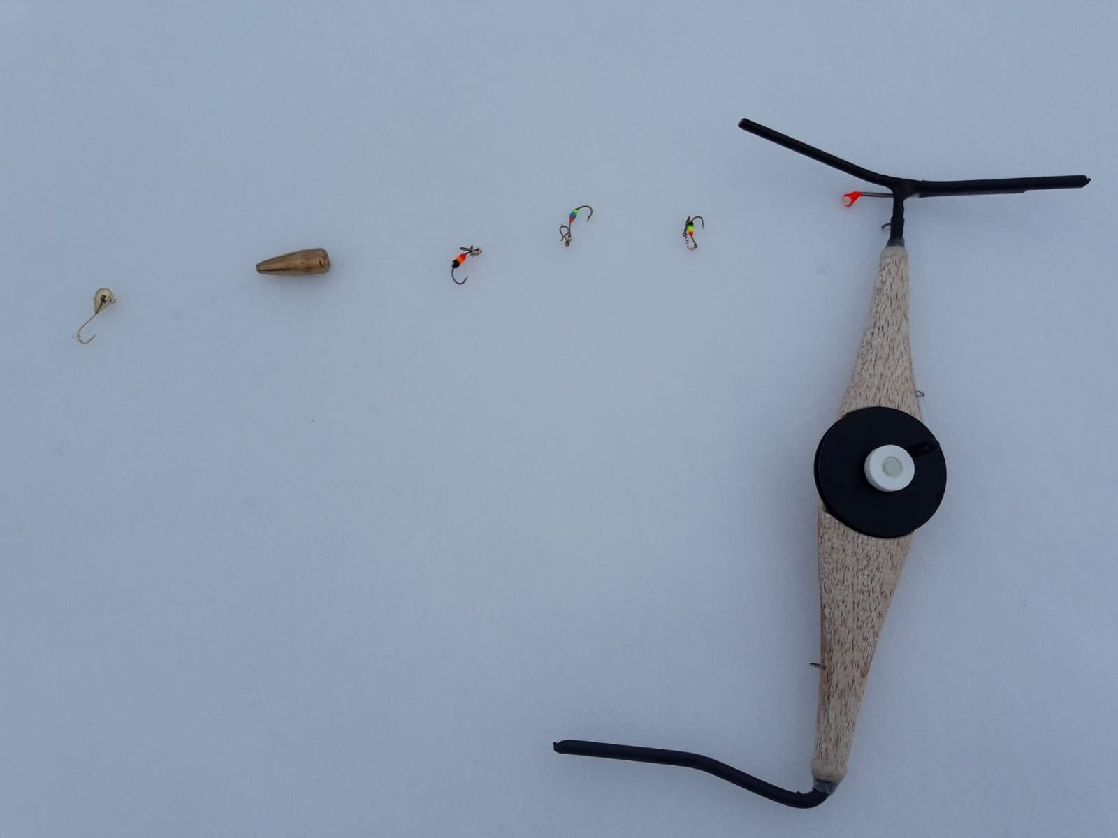 Läksin joskus puoli yhdentoista aikaan järvelle. Kolmen aikaan katsoin kelloa ja hämmästyin miten nopeasti päivä on mennyt. Etsin pilkkipaikkoja ensin tuolla vanhalla pystypilkillä ja värikoukulla varustetulla pilkkivälineellä. Kun löysin ahvenia, vaihdoin tuohon niin sanottuun vitjapilkkiin, jonka tuossa rakentelin. Siinä on erilaisia värikoukkuja kolme kappaletta ja kultainen morri. Sitten ihan alimmaisena tietenkin tuommoinen painokuula. Tein sellaisen havainnon, että kun aloin tällä pilkkimään reijästä, mistä löysin hyvin ahvenia, niin ahvenet iski todella hanakasti kiinni tähän vitjapilkkiin. Välillä niitä oli siinä kaksikin kerrallaan, välillä yksi. Kyllä tuntui houkuttelevan hyvin.