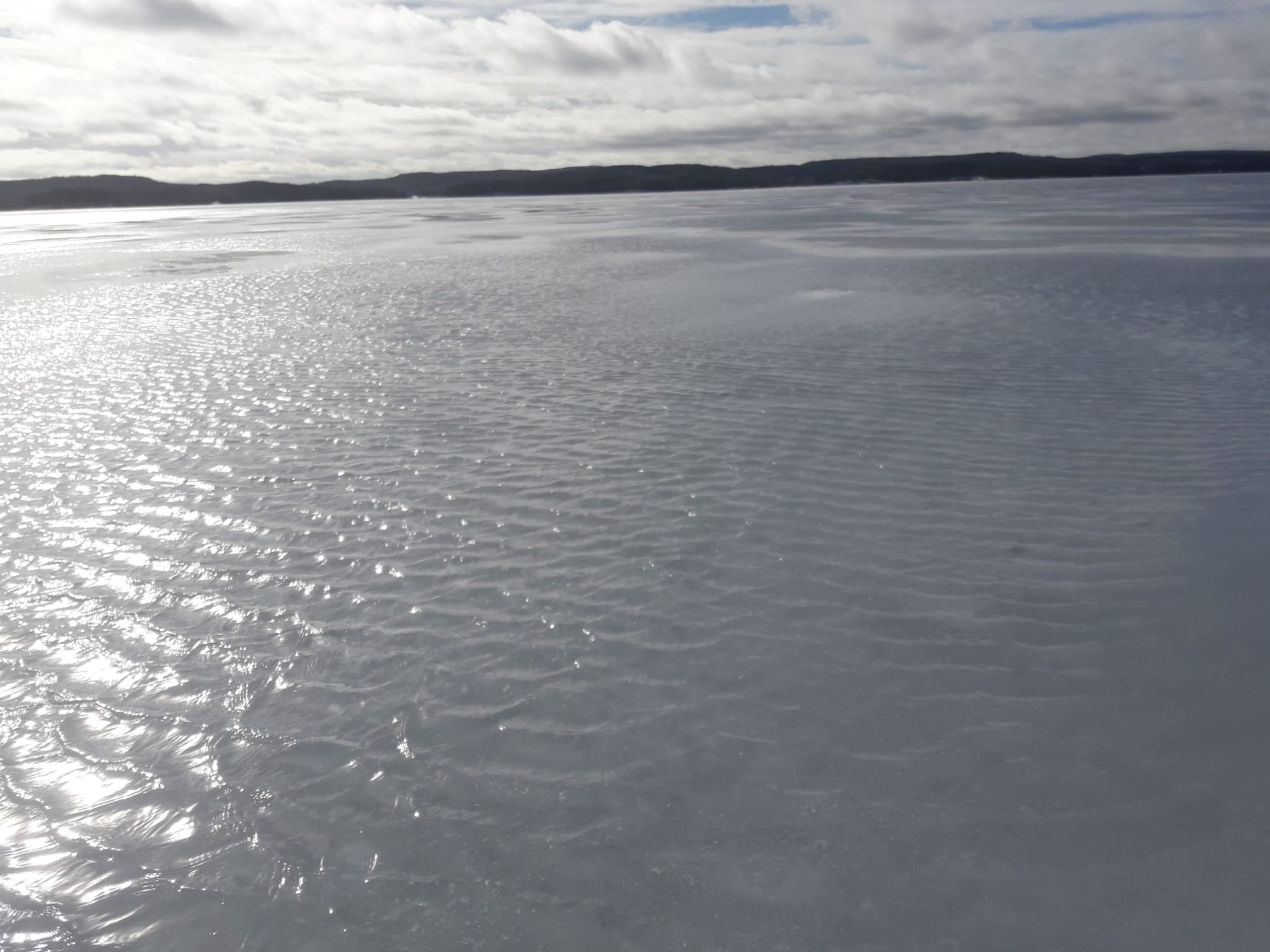 Aamulla 2 astetta lämmintä. Päivällä 6 astetta lämmintä. Tuolla oli kaikki sohjot selällä sulaneet, muuttuneet ihan vedeksi. Siellä oli paikoin jopa 10 senttiä vettä jään päällä. Mönkiäkin ui jo aika mukavasti, mutta kyllä sillä hyvin pääsi. Jouduin ottamaan yhden jatan pois. Siinä oli niin paljon vettä kun kairasin avannot. Avannon kun aukaisin, niin sieltä alkoi vetää niin valtava määrä vettä, että se syö sen kaiken avannonympäristön. Siihen tulee niin iso reikä, että ei ole asiaa mennä sitä verkkoa enää kokemaan. Otin sen pois sieltä kokonaan, niin ei tule mitään ongelmia sen kanssa.