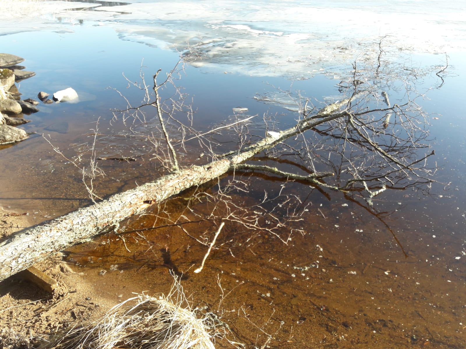 Yö oli tosi lämpöinen. Aamullakin viitisen astetta lämmintä ja aurinko paistoi oikein kirkkaalta taivaalta. Eilen kattelin tuossa rannassa, kun oli tikat hakannut yhtä puuta ja tutkin sitä. Sehän olikin aika onton oloinen. Tänä aamuna otin moottorisahan ja kaadoin sen siitä pois. Se olikin aika haastava puu, kun se oli kenolla laiturille päin. Minun piti vetää se taljalla toiseen puuhun kiinni, että sain sivuttaisvedon siihen, ettei se kaatunut laituriin. Kun sahasin sitä juuresta, niin siellä ei oikeastaan ollut enää kuin kuoret jäljellä. Se ihan rojahti järveen. Se on hyvä, että sain sen pois. Olisi kesällä saattanut olla jopa vaarallinen tuulella. Olisi voinut kaatua vaikka jonkun päälle. Ei uskaltanut jättää sitä siihen pystyyn. Sinne se järveen molskahti.